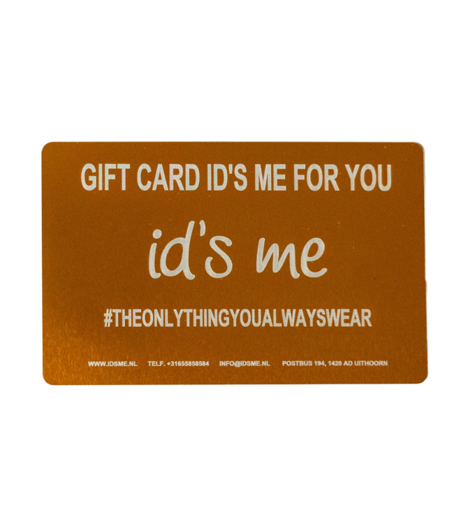 Een Id’s me staat vol met essentiële info. Naam, noodcontactgegevens en belangrijke medische info staan gegraveerd op een ID plaatje. Maar wil je een Id's me aan iemand anders schenken en weet je de gegevens niet? Geef dan een Id's me Gift Card. Je kan kiezen voor de waarde van een bepaald product, of een vast bedrag. Overigens kan de ontvanger van de bon elk product uit ons assortiment kopen wat hij/zij wil. Er is echter geen restitutie van een eventueel restant van de Gift Card!